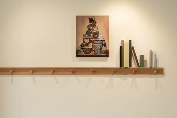 Peg rail/ books: reclaimed Oregon, dowel, Pine, Acrylic paint, Install size variable